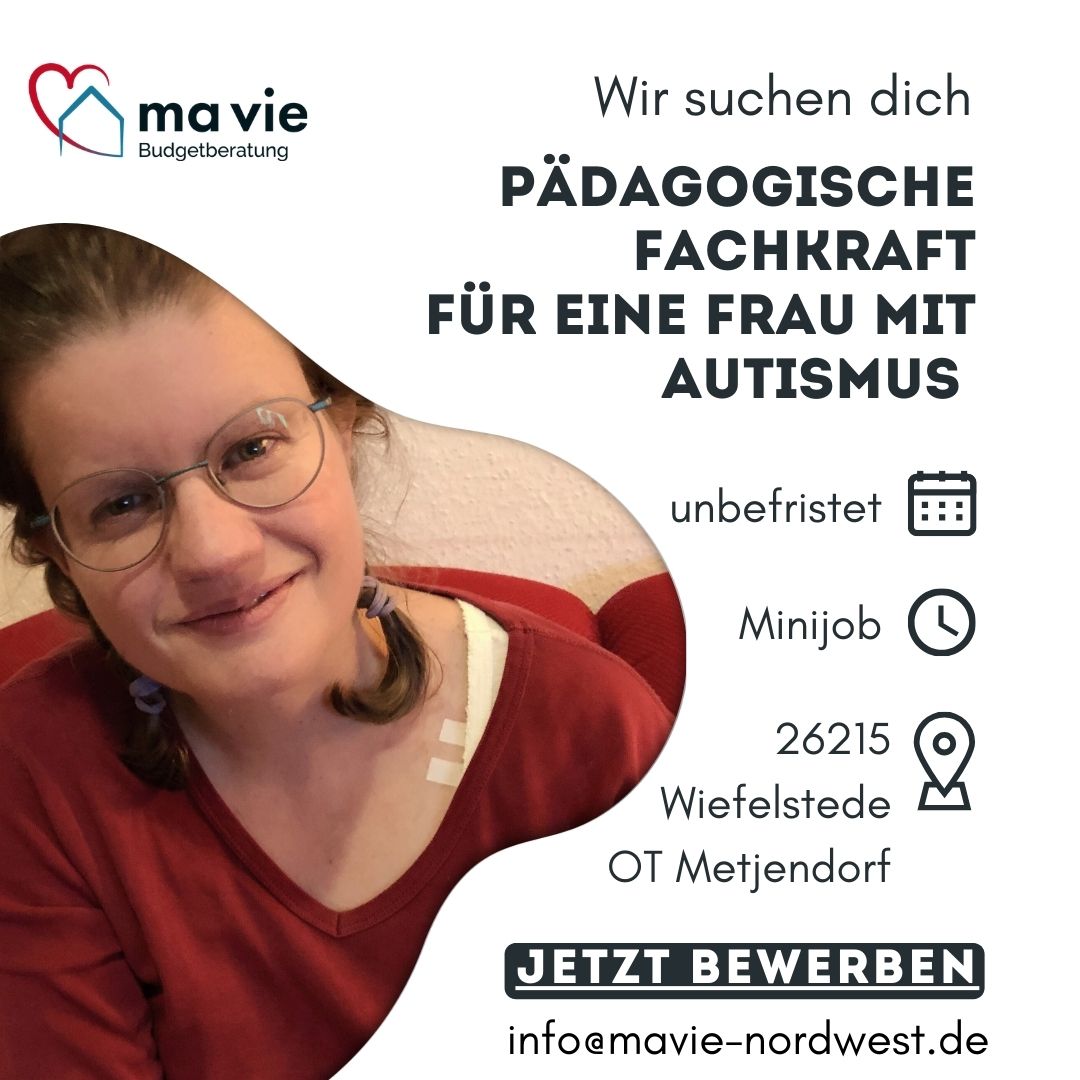Für eine autistische Frau mittleren Alters, die zwar spricht, aber nur für geübte Ohren verständlich ist, suchen wir eine Freizeitassistenz mit Herz. Eine gute Einarbeitung ist Ihnen hier garantiert! Gewünscht ist: • Erfahrung im Umgang mit Menschen mit Behinderung (gerne auch speziell mit Autismus) • Einfühlungsvermögen • Pädagogisches Selbstbewusstsein • Gerne eine pädagogische Ausbildung, aber kein Muss Zunächst suchen wir Jemanden, der stundenweise an den Wochenenden assistiert (Fr. und Sa. nachmittags startend mit ca. 2 Std.). Nachdem gegenseitiges Vertrauen aufgebaut wurde, ist ein Ausbau der Arbeitszeiten sehr gerne möglich. Unsere Kundin liebt die Natur, geht gerne spazieren, pflanzt gerne Gemüsepflanzen im Garten an und hat Freude am Singen. Aufgrund einer Angststörung ist es wichtig, dass diese Frau jemanden an der Seite hat, der Ruhe ausstrahlt und sich nicht so leicht aus der Bahn werfen lässt. Das erwartet Sie: • faire Bezahlung nach TVÖD • ein wertschätzendes, freundliches Arbeitsumfeld • eine gute Einarbeitung Wir freuen uns darauf, Sie kennenzulernen!